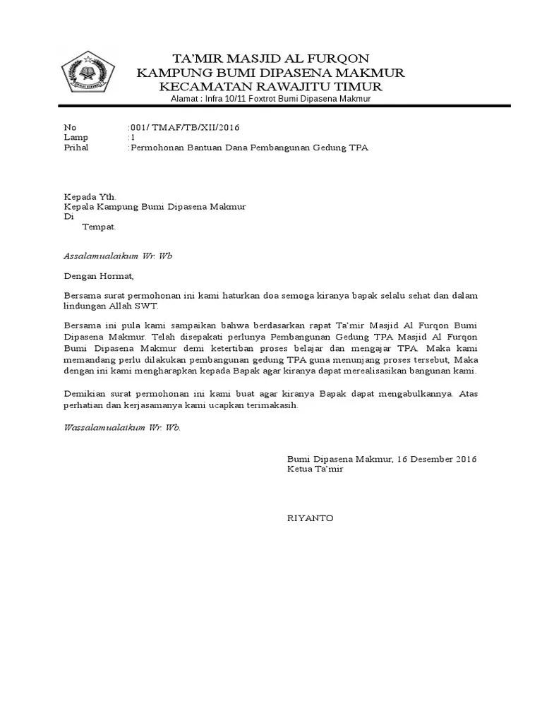Proposal permohonan bantuan dana pembangunan masjid ta'mir masjid "al istiqomah" rt. 12 desain terkait dengan contoh surat mohon bantuan dana pembangunan masjid. Kali ini adimin akan berbagi contoh surat permohonan dana untuk pembangunan masjid. Download contoh surat permohonan bantuan dana pembangunan masjid download document. 12 desain terkait dengan contoh surat permohonan bantuan pembangunan masjid.